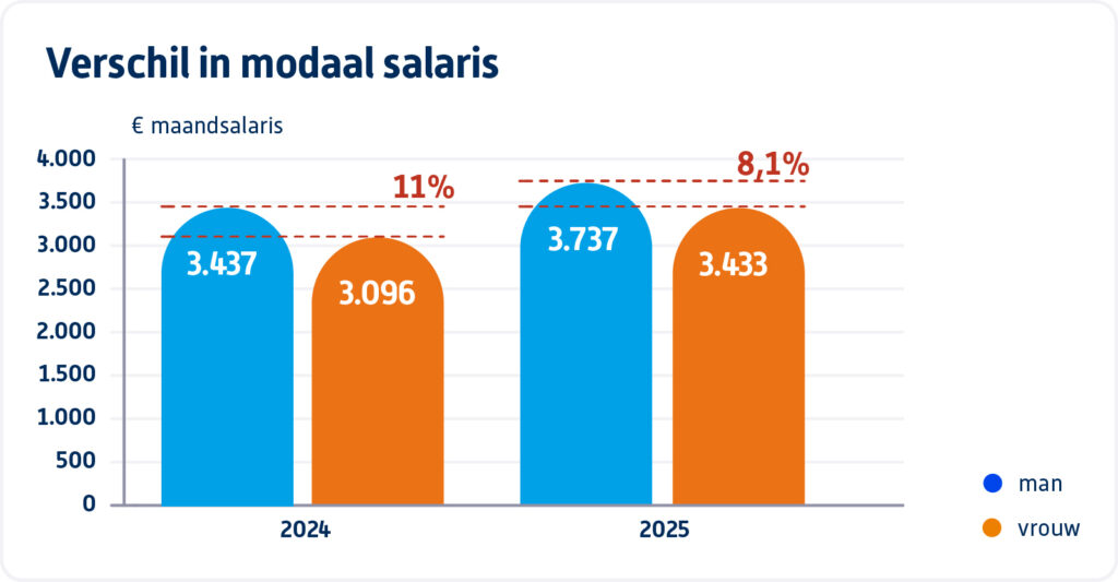 Het modaal salaris van mannen is in januari 2025 € 3.736,52 per maand. Bij vrouwen ligt dit op € 3.433,48 per maand. Een verschil van 8,1%. Dat is fors, maar begin 2024 was dit verschil nog 11%. Dit zijn gemiddelden: beloningsverschillen zijn met name bij 50-plussers en in sommige sectoren groot. Dit blijkt uit onderzoek van MKB Servicedesk en Van Spaendonck Groep. In aanloop naar Internationale Vrouwendag zijn ruim 1,2 miljoen recente, geanonimiseerde loonstroken in het mkb geanalyseerd.