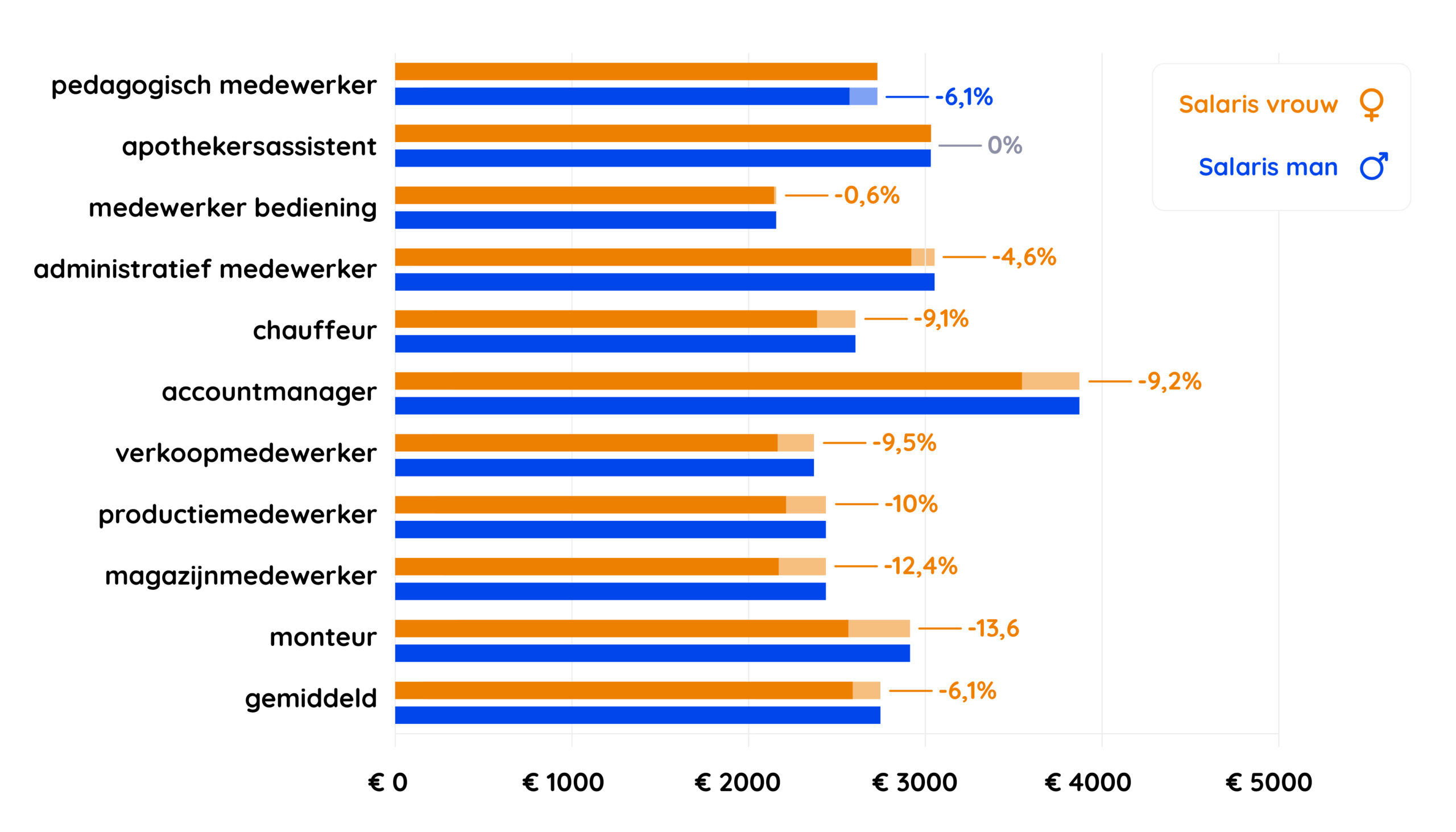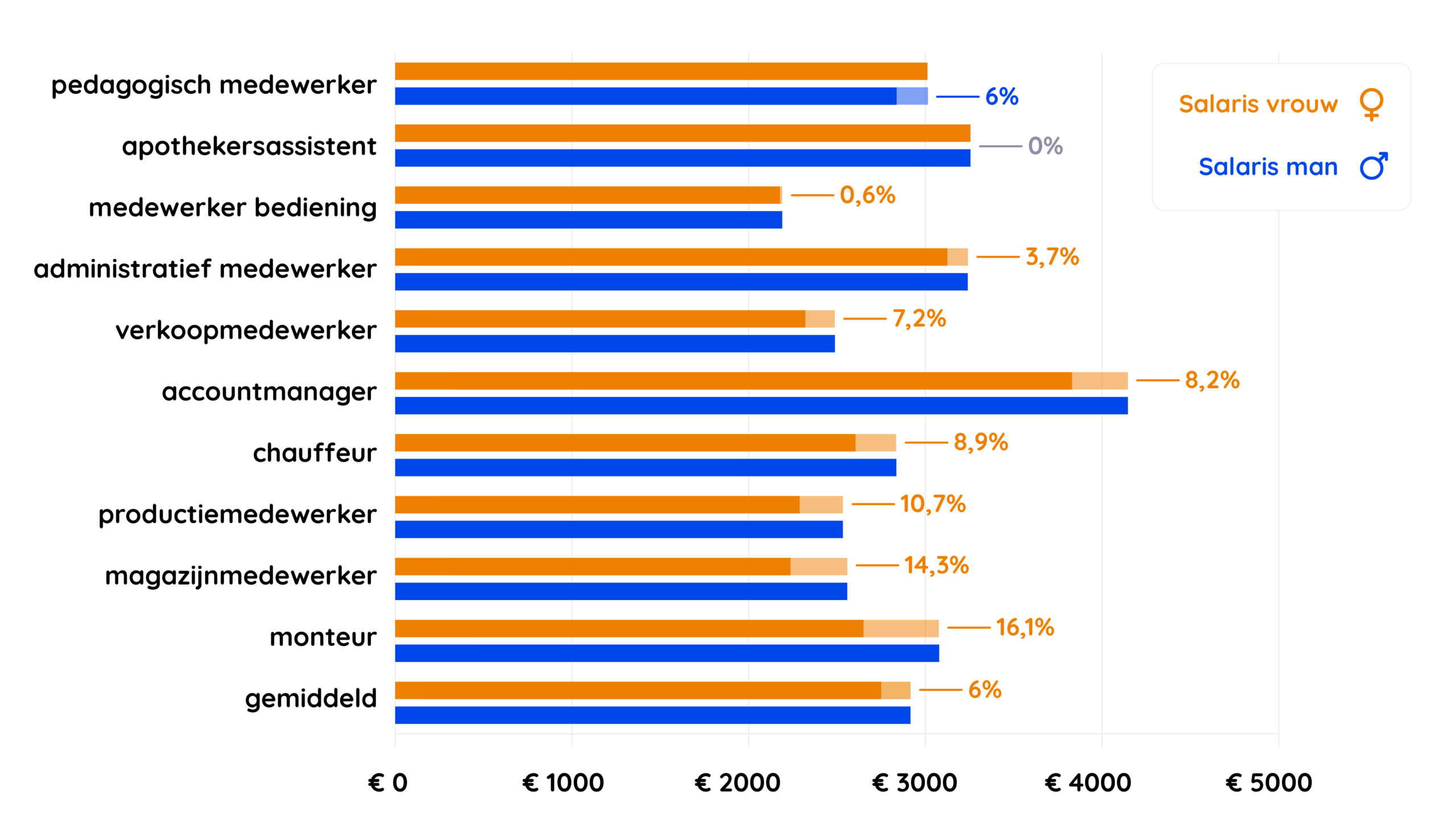 Gemiddeld verdienen mannen 6% meer in deze 10 meest voorkomende functies. Maar er zijn ook beroepen waar er geen verschil is of vrouwen juist meer verdienen. Bij de apothekersassistenten is er geen significant verschil in beloning. En vrouwelijke pedagogisch medewerkers verdienen juist weer 6,2% meer dan hun mannelijke collega’s.
